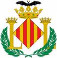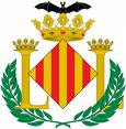En escudo losanjado, campo de oro con cuatro palos de gules, dos eles coronadas como tenantes y en la parte inferior dos ramas de laurel. Al timbre, corona real abierta surmontada de un murciélago, visto de frente y con las alas extendidas, de sable.