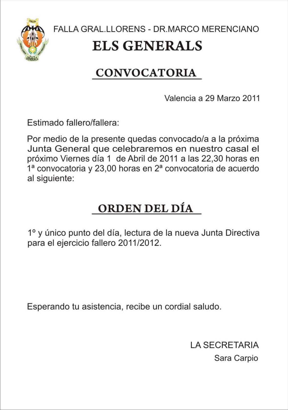 Se recuerda que el próximo Viernes 1 de Abril habrá de nuevo junta general para realizar el nombramiento de la nueva Directiva y delegados para el ejercicio 2011-2012.